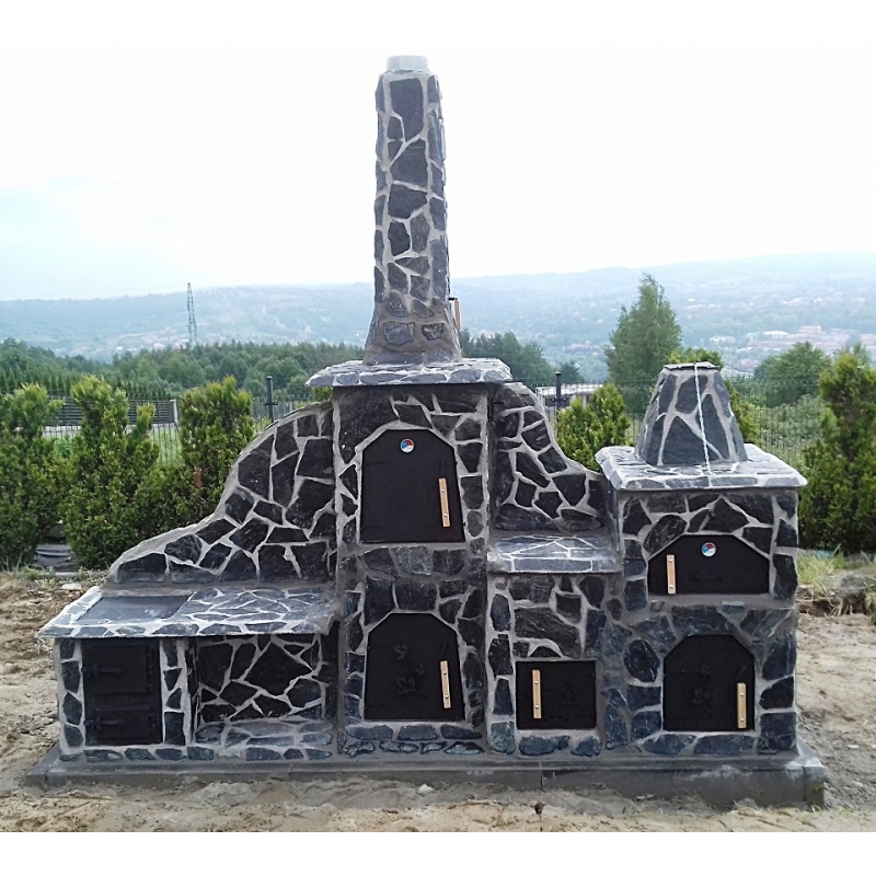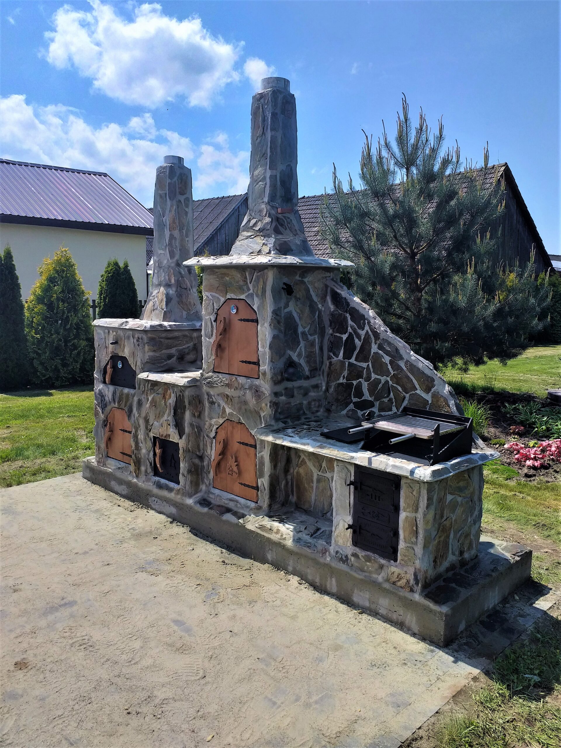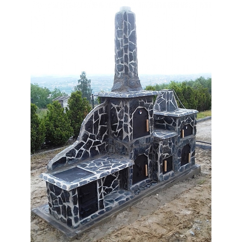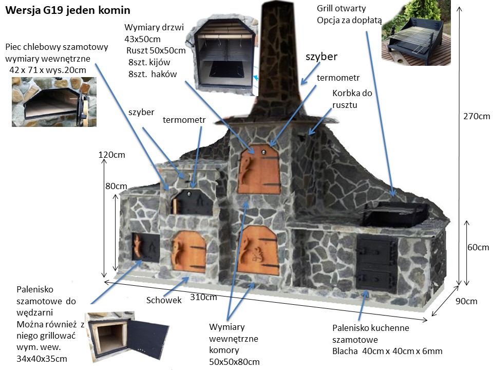 Grill Wędzarnia G19 zawiera piec chlebowy z osobnym kominem, płytę do gotowania oraz zamykany schowek.