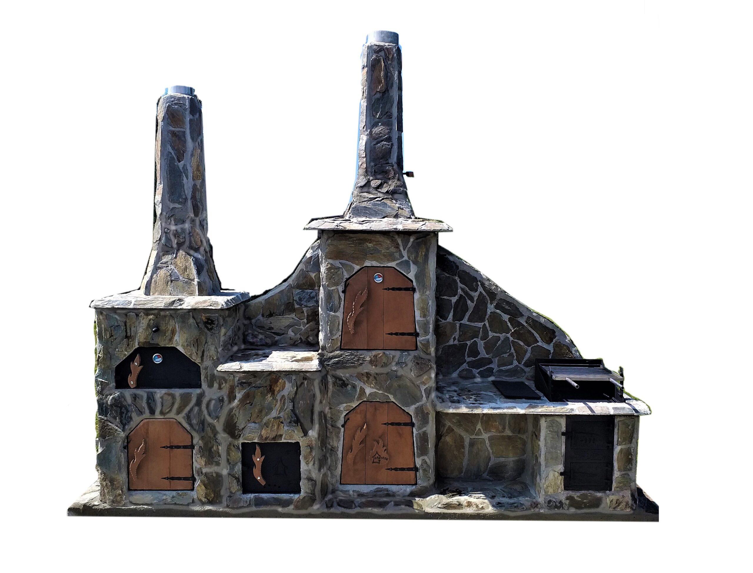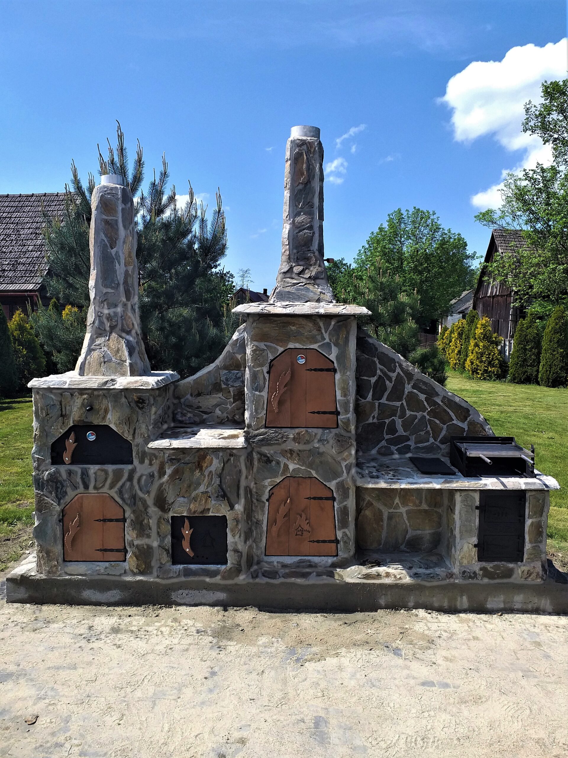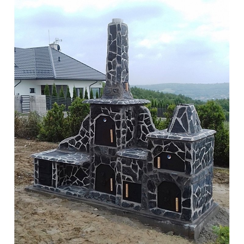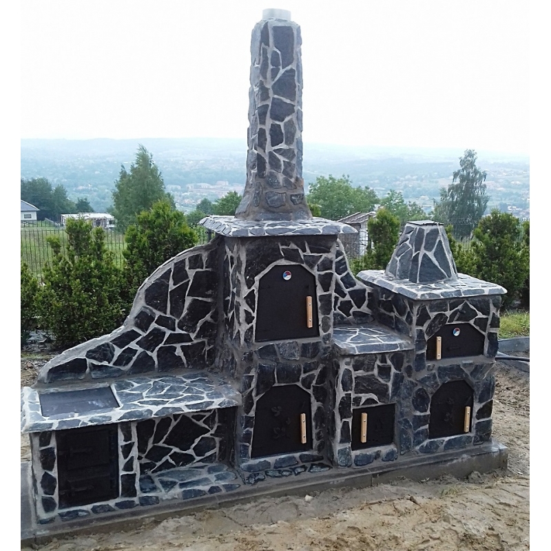 Grill Wędzarnia G19 zawiera piec chlebowy z osobnym kominem, płytę do gotowania oraz zamykany schowek.