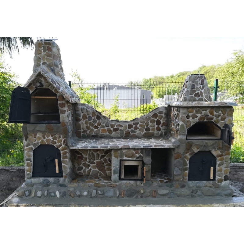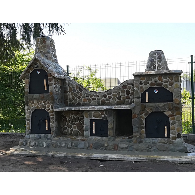 Grill Wędzarnia G1K zawierająca piec chlebowy z osobnym kominem, dodatkową wnękę na opał, ściankę, zamykany schowek oraz drzwi metalowe w zestawie.